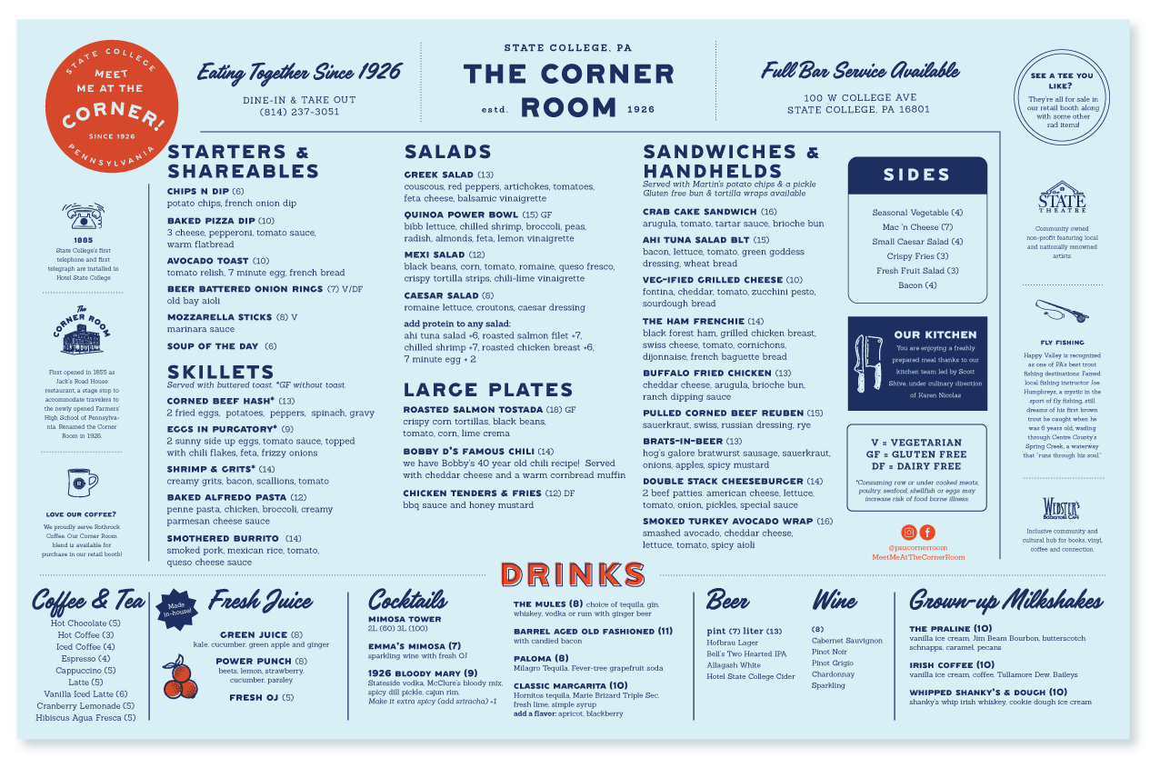 The Corner Room is a beloved State College Diner that has been around since 1926. We gave the brand a facelift but made sure to maintain its timeless charm.